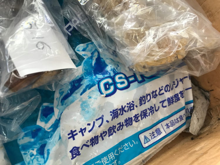 (試食用の乾物の下に、保冷剤を敷いて品質管理)