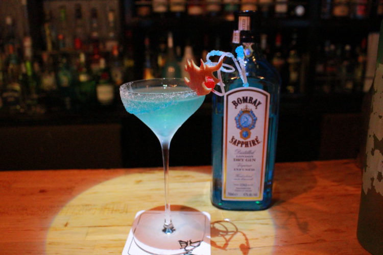大人気マンガ「鬼滅の刃」の主人公 竈門炭治郎の必殺技である「水の呼吸」にちなんだカクテル。ジン、マスカットリキュール、ブルーキュラソーなどを合わせ、炭治郎の技のひとつ「流流舞い(2巻16話参照)」をイメージした、佐藤さん渾身の力作です。炭治郎の額のアザを形どったりんごと、流流舞いをイメージしたくずきりがあしらわれているのもポイント!