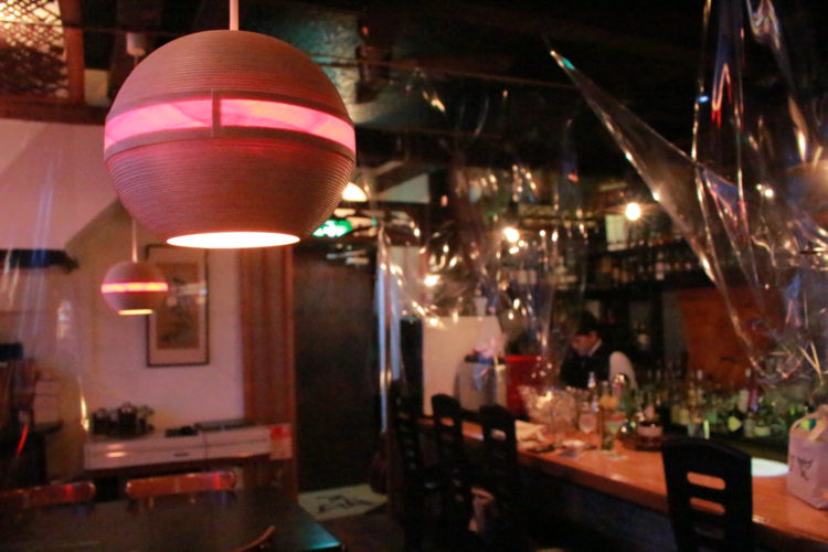 JR五能線 板柳駅から徒歩5分ほどの場所にある「Bar聖(ひじり)」。蔵をイメージした店内はブナコランプが灯る落ち着いた雰囲気で、カウンターには約300種類のお酒がずらりと並んでいます。