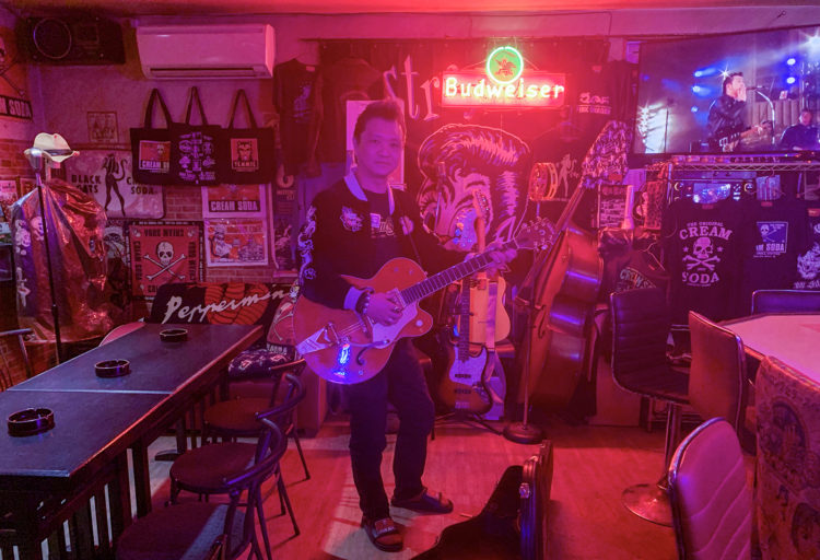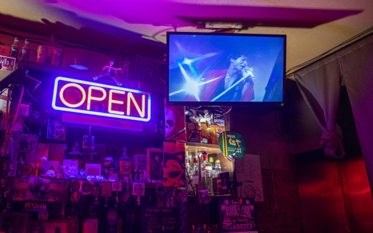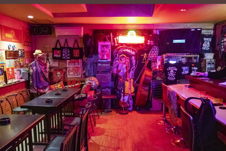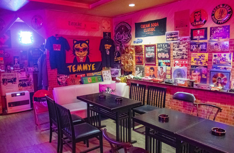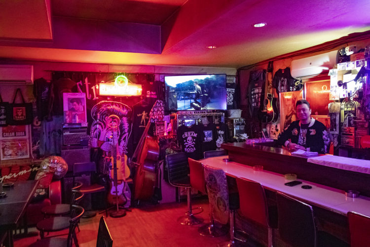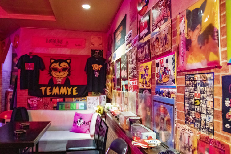 ドアを開けると、1970年代〜80年代に日本で流行したロックンロールを象徴するグッズで壁が装飾された、その世代の人にとっては若かりし頃を彷彿とさせるような雰囲気が漂います。