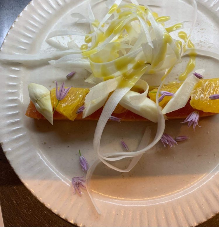 八朔ヴィネグレットと生のホワイトアスパラガスのサラダ仕立て」