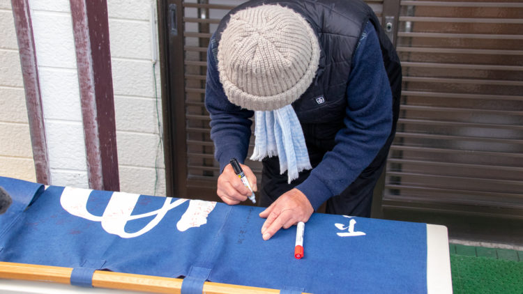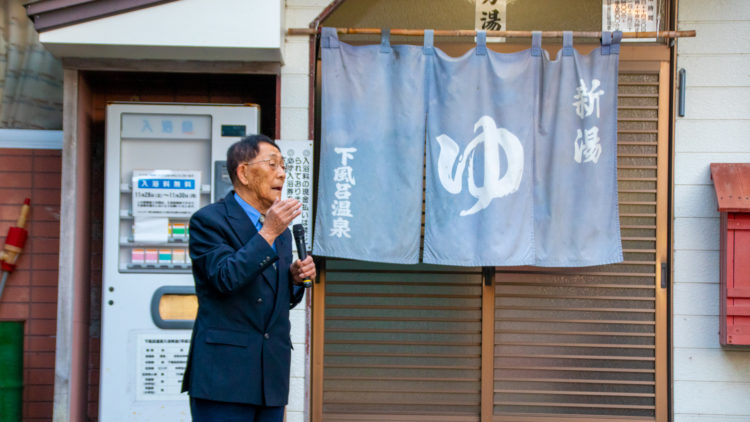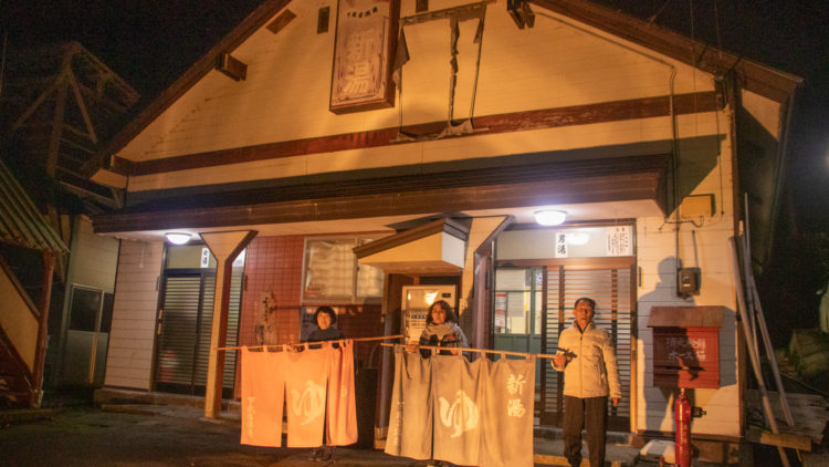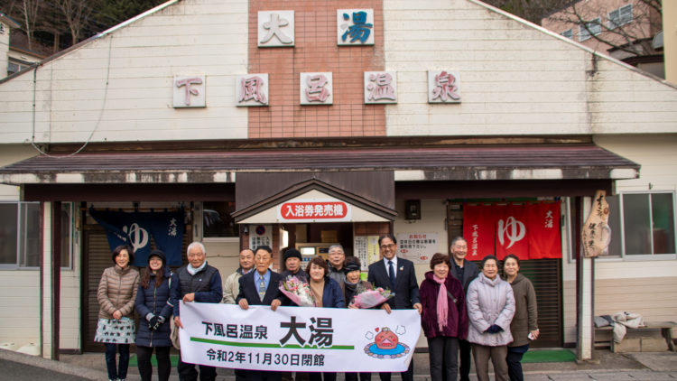 最後の湯守となった大湯と新湯の番台さん達が、「ゆ」の暖簾を下ろし、周りで見守る人たちに深々と礼をして、消灯。