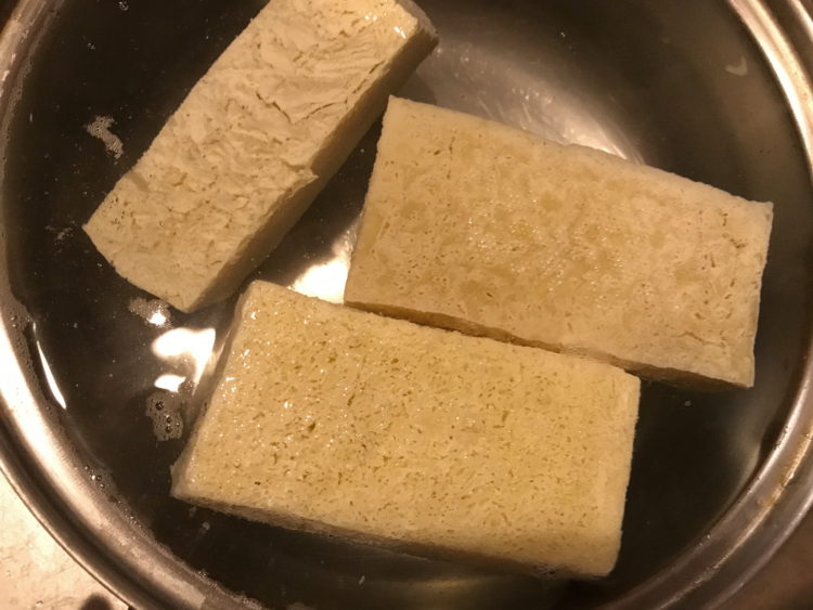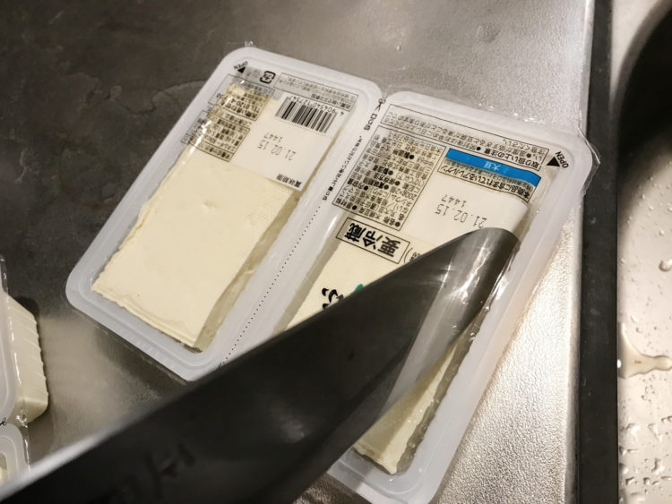 さて、豆腐は、酸ヶ湯と同じものが欲しかったのですが、用意したのはタイシ製のセブンイレブンブランドの木綿豆腐。早速取り掛かります。