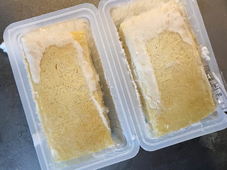 解凍後、上から軽く押して水を抜くとこんな優しい感じになりました。あめ色っぽさが消え、水が抜けた部分に空洞ができています。