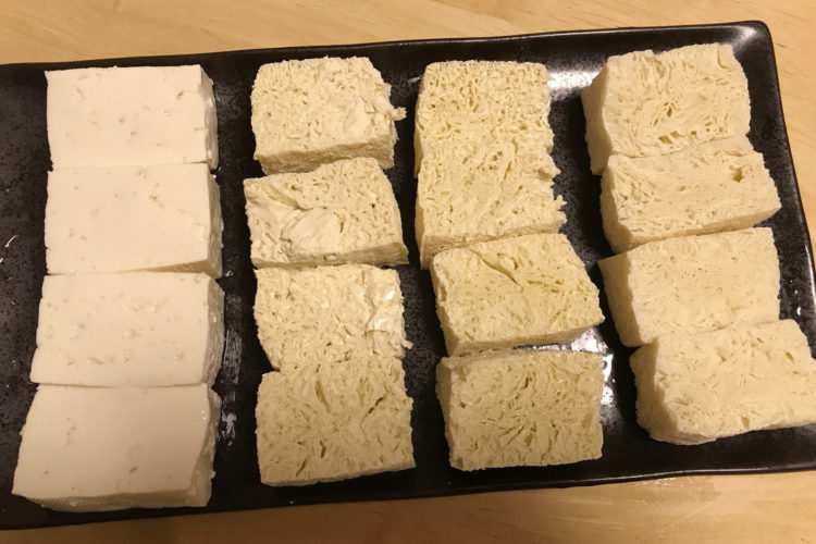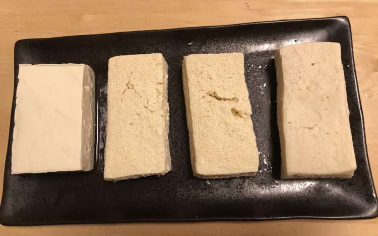 左から、普通の木綿豆腐、一夜干し、一昼夜干し、酸ヶ湯豆腐