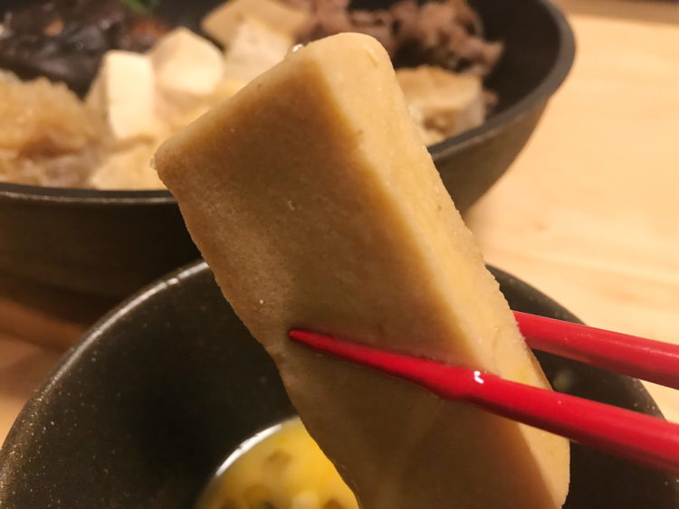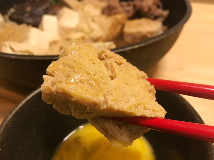 やさしく扱えば、煮ても型崩れしにくいです。口に含むと感じられる細かなテクスチャーは、普通の木綿豆腐や高野豆腐とも明らかに違い、ふんわり繊細な湯葉を食べている優しい感覚です。それはまさに第三の豆腐。煮汁もなじみ、安定感ある美味しさで、病みつきになりそうです。