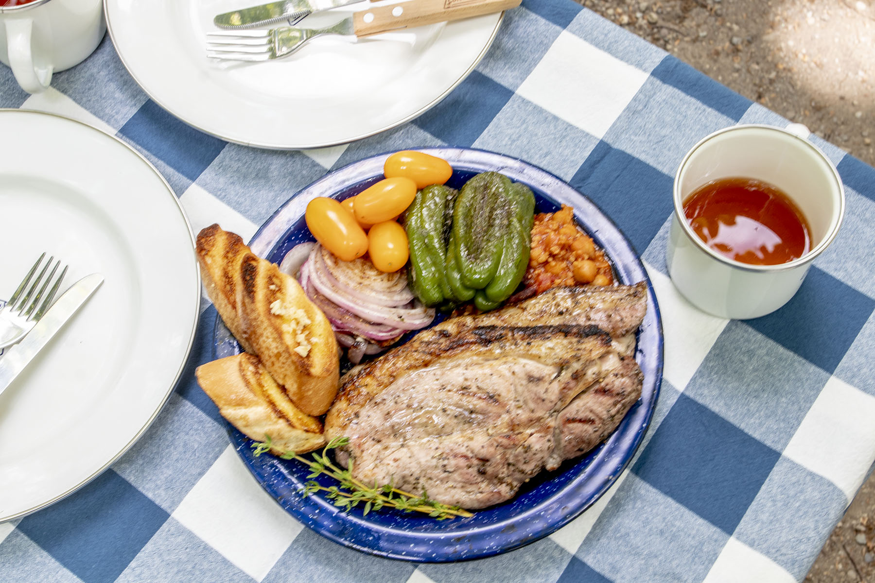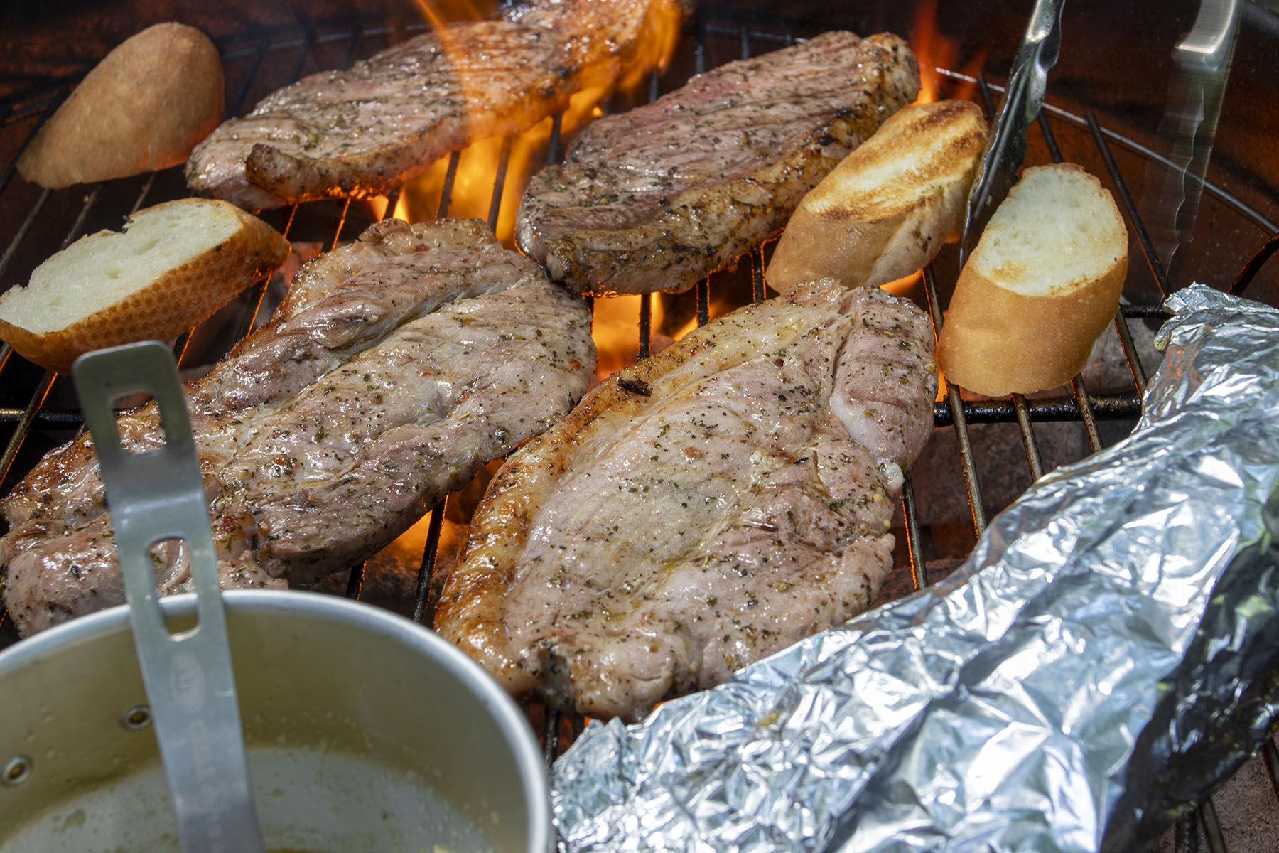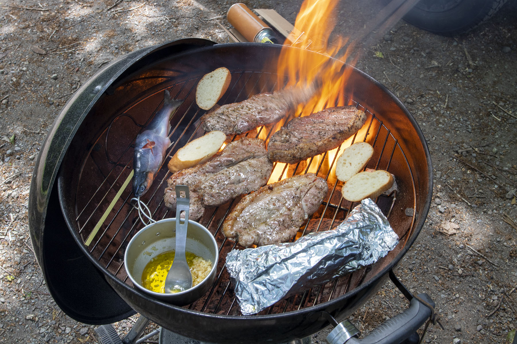 次に、ガーリックポーク、ホイルに包んだヒメマス、串焼きにしたヒメマスをグリルにのせて焼いていく。