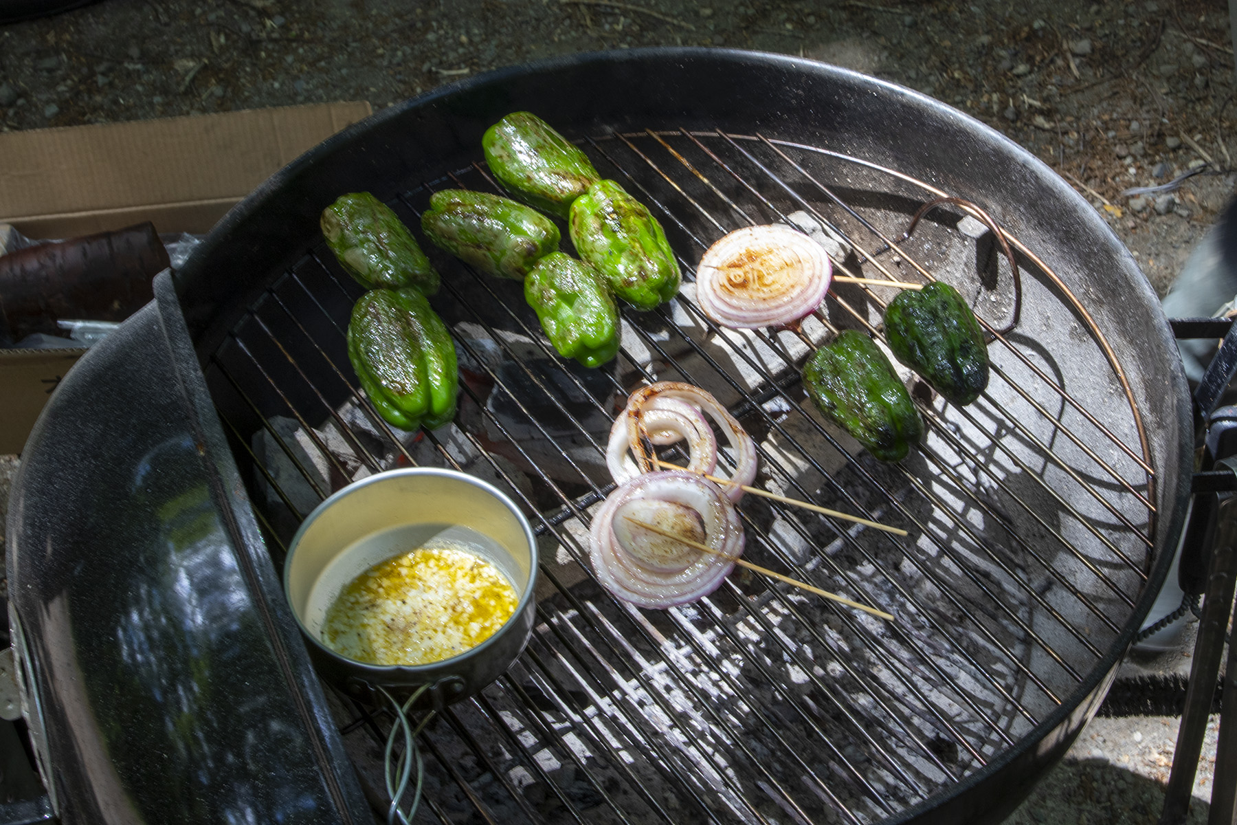 予め、グリルの上で、みじん切りにしたニンニクを入れたオリーブオイルを煮詰めておき、玉ねぎとピーマンに塗ってからグリルで焼いていく。