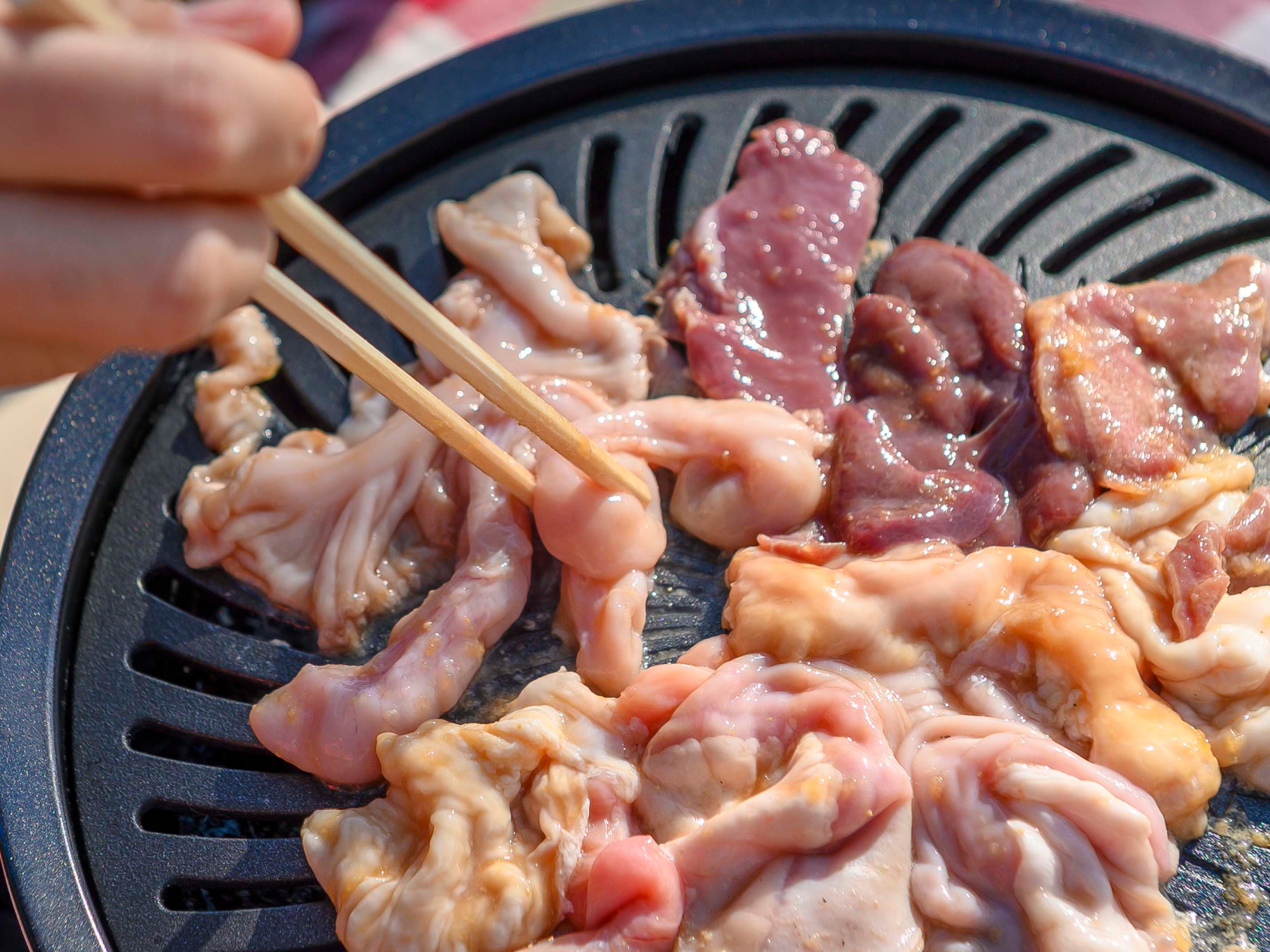 そこで、ふじ原木公園(屋外)で、このプログラムの案内役の1人であり、りんご農家の方が、小さいころから食べていた地元の人気精肉店の新鮮な豚ホルモン(ホルモン・サガリ)を使います。ホルモンはつやっつやで美しく新鮮そのもの。全く臭みがありません。炭火焼きの匂いも良く、いくらでも食べれてしまいますね。