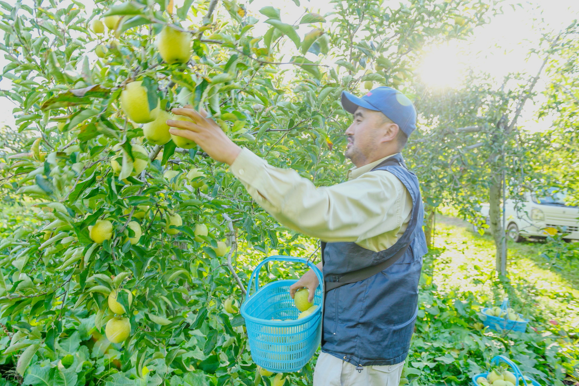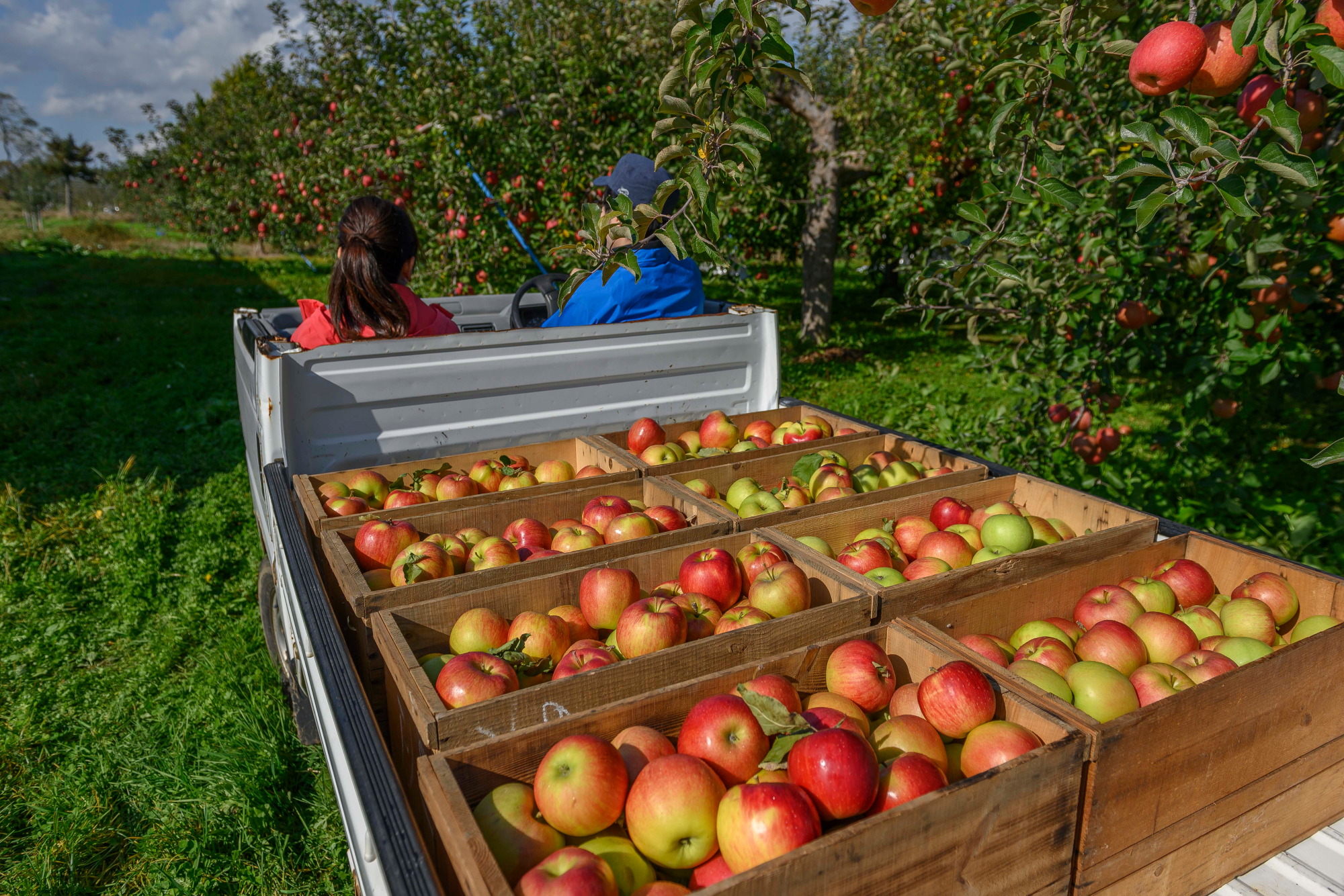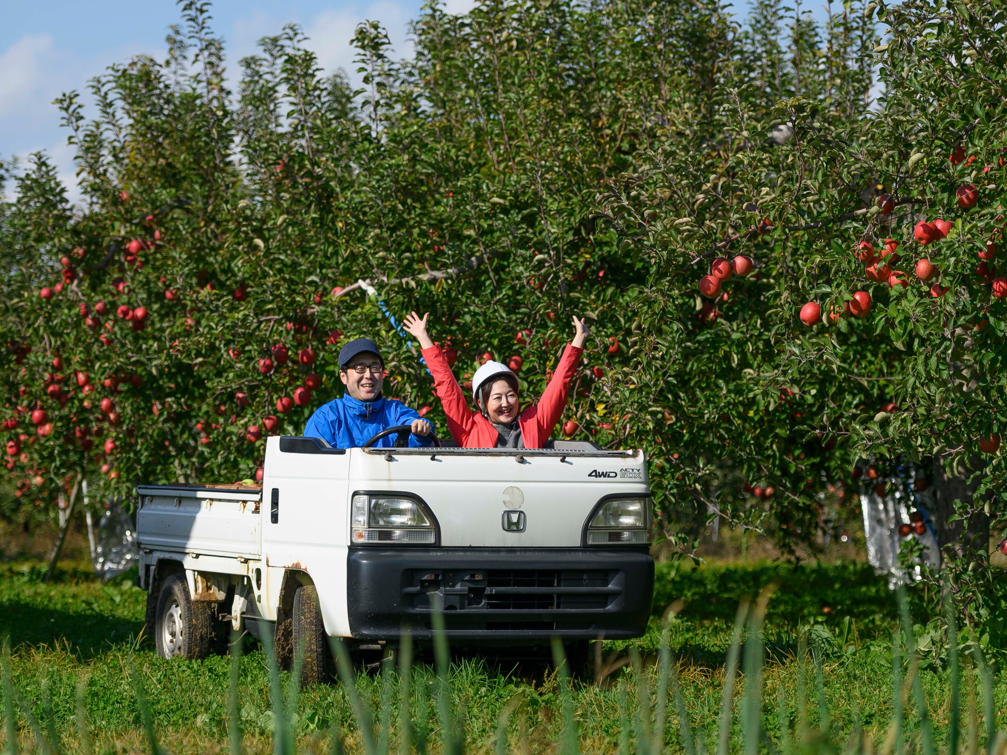 軽トラックは、りんごやはしごを運んだりと、りんご農家の生活に密着した良き相棒です。ザ・働くクルマ。仕事で使わない限り、地元でも軽トラックに乗る機会なんて滅多にないんです。今回、希望者には、軽トラックの助手席に乗って、ふじ原木公園内のプチ・ドライブに御案内します。この機会をお見逃しなく!