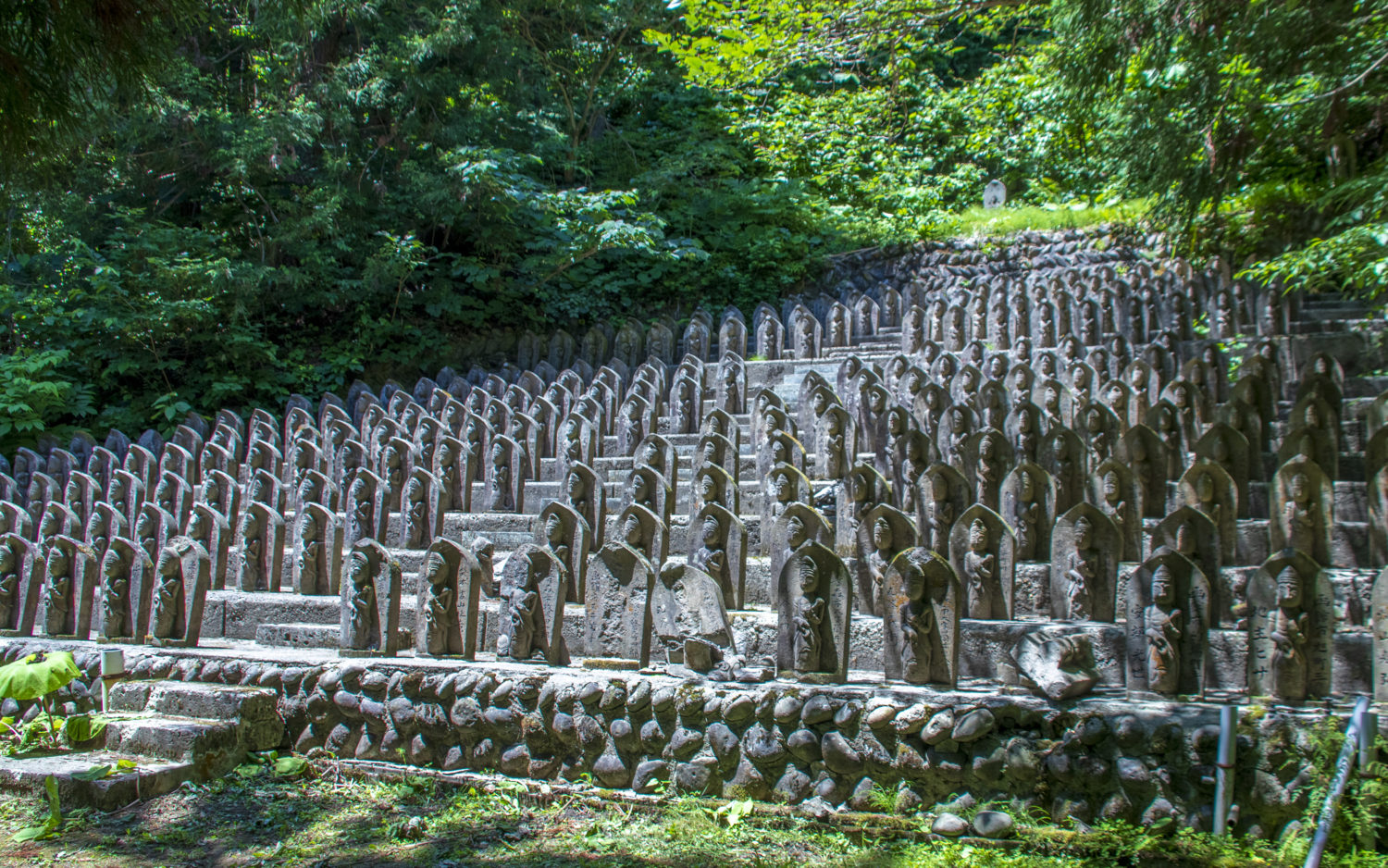 1970年代、土砂災害で境内の一部が被害に遭い、多くの人々から援助を受けました。寄付をした人たちの家内安全を祈願しようと、当時の住職がこれらの石像を寄進したのだといわれています。1体ずつに寄進者の名前が掘られており、顔の表情が少しずつ違います。