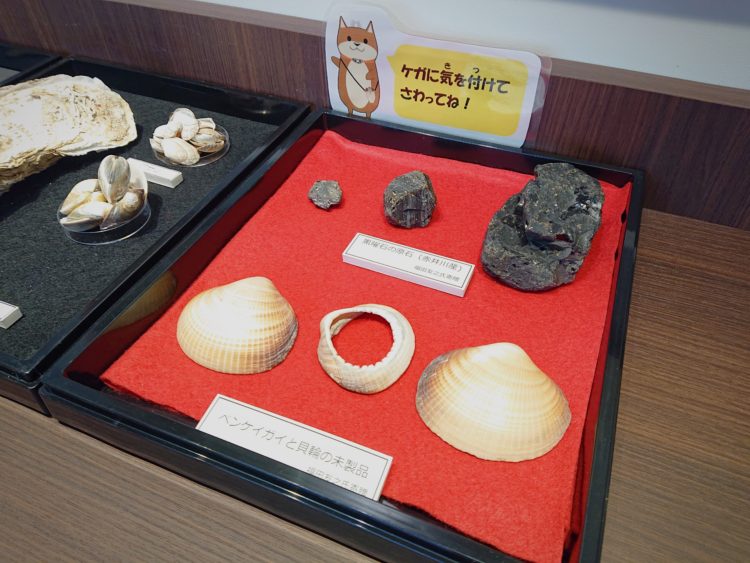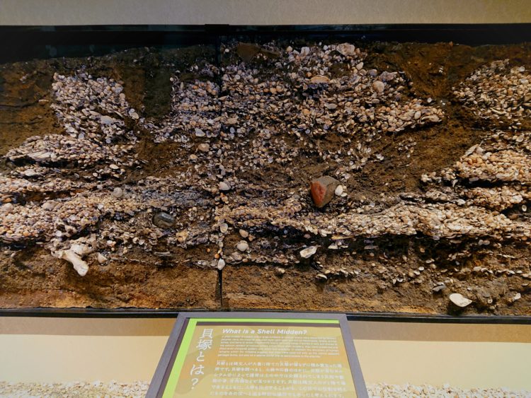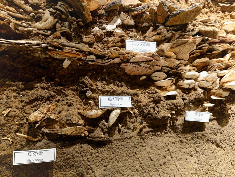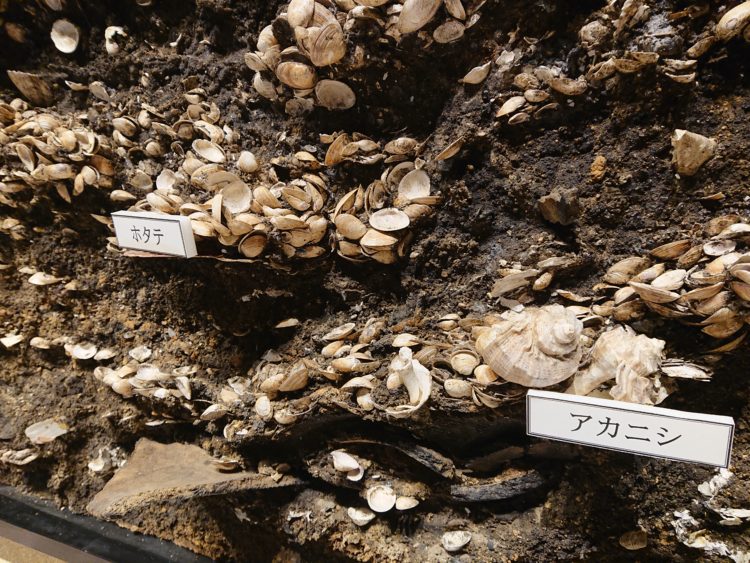 「下のほうは海水で育つハマグリ、ホタテ、カキが多くて、上のほうは汽水で育つヤマトシジミが中心です。環境が少しずつ変化していったことがわかります」