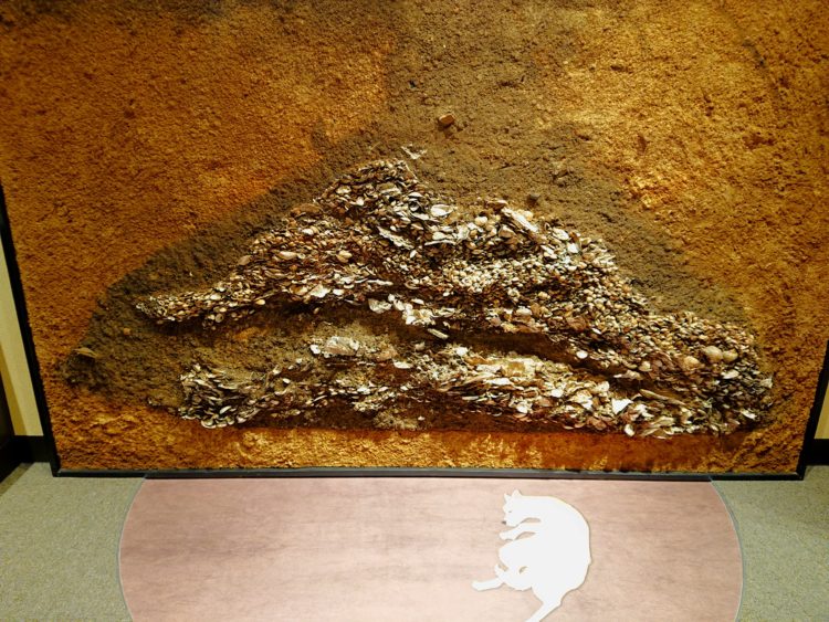 「貝塚の断面を直接剝ぎ取ったものです。」