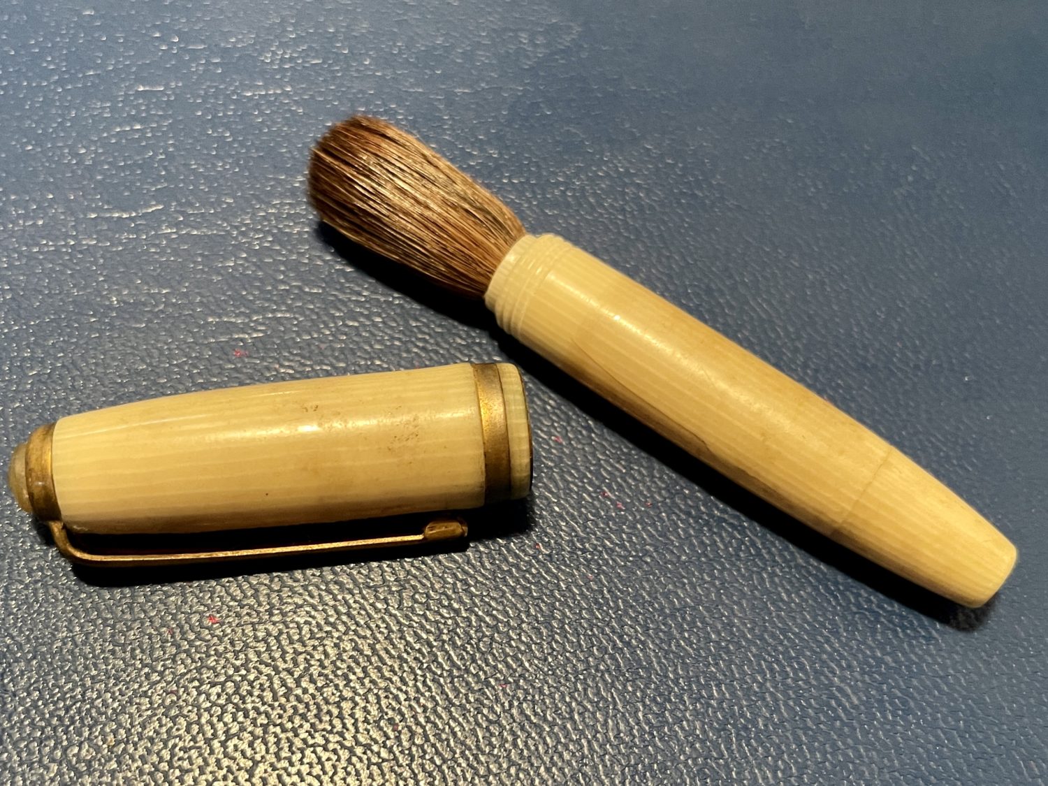 下の写真、目を凝らすと中央の万年筆の首軸に、小さな赤い点が二つが横に並んでいるのが見えますか?この胴軸を少し回し、点の位置をずらすとインクが出なくなる構造で「首旋回インキ止星合わせ万年筆」と呼ばれるそうです(ながっ!)。仕組みもさることながら、大正浪漫感満載の繊細な螺鈿細工が素晴らしいですね!
