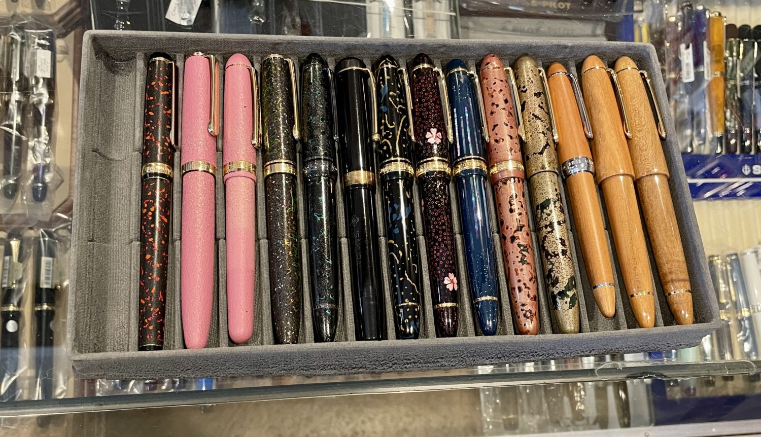 その他にも、平山萬年堂セレクトショップ「久三郎」には、津軽塗の万年筆や錫製、セルロイド製、弘前城の桜材を使用したものなど、魅力的な万年筆が溢れており、ただただ見惚れるばかり。