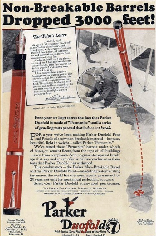 PARKER(パーカー)社は、ビルや飛行機の上から落としたりとユニークな耐久テストを行ってPRし、見た目だけでなく末長く愛用できる点を強調したようですよ。