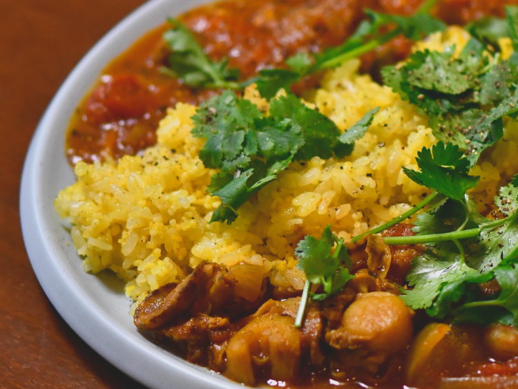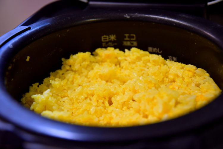 そして、これに調子づきまして、今なら「カデ飯」をどんな風にして食べるかな?と思って閃いたのが、スパイスカレー。インド米もパさっとして汁気の多いカレーに非常に合いますから、それならと、飯(米75:ひえ25)のイエローライスを作ってみました(黄色はターメリック)。