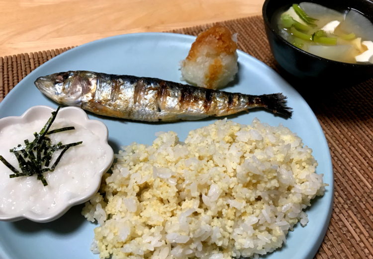 作ったのは、先ほどの文献にあった、カデ飯(米50:ひえ50)、いわしの塩焼き、とろろ、菜っ葉と豆腐の味噌汁。