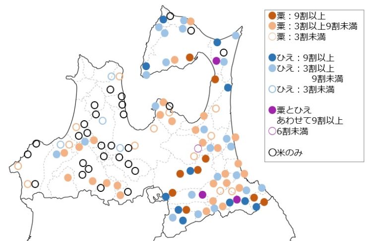 明治時代から大正初期にかけて、青森県の日常の食事は米に何らかの穀物を混ぜ合わせるのが基本だったようです。津軽半島は、米のとれる比較的暖かい気候だったことや新田開発が進んだこともあり、米だけを主食としていた事例も多いです。一方、南部地方、下北地方は、夏の冷たい「ヤマセ」でも栽培できる「粟」(あわ)、又は「ひえ」を米に混ぜていたとする事例が多く、こうした混ぜたご飯を「カデ飯」と呼ばれていたそうです。ちなみに、粟とひえの両方を混ぜる事例はあまり多くありません。