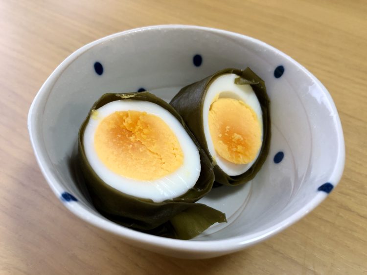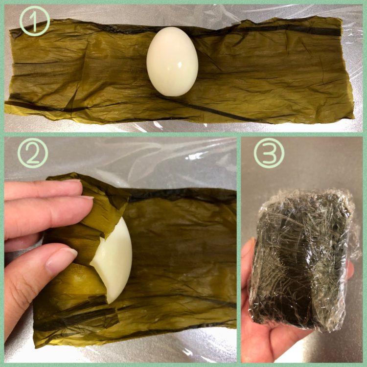 続いて、何かに巻いてみようかと思い、ゆで卵に巻いてみました。こんな感じで↓