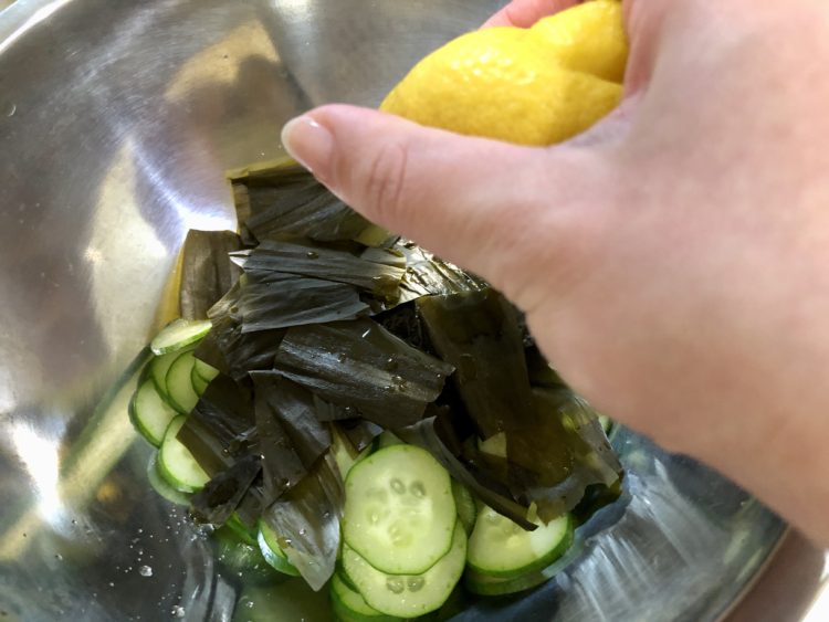続いて、酢との相性は?ということで、酢の物にしてみます。優しい味にしたいので今回はレモン汁で。