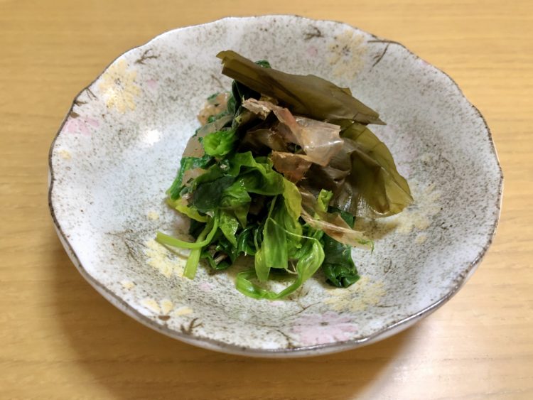 続いて、何かで和えてみようかと思い、昆布を長方形型にカット、ほうれんそうと鰹節と共にだし醤油で和えてみました。ほうれんそうを茹でて、ボウルに材料を全部入れて和えるだけ。ほうれんそうはこの時期の甘みが強い「寒じめほうれんそう」を使いました。