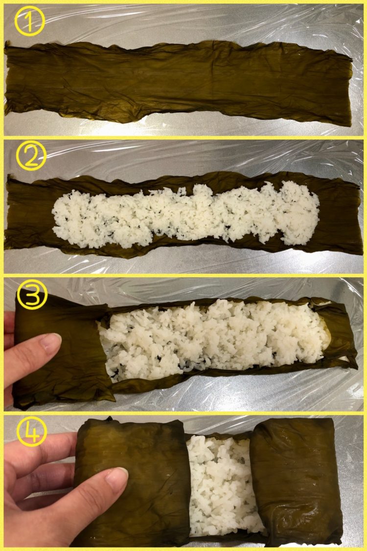 昆布を開いて、四隅を空けてアツアツのごはんを盛ります。