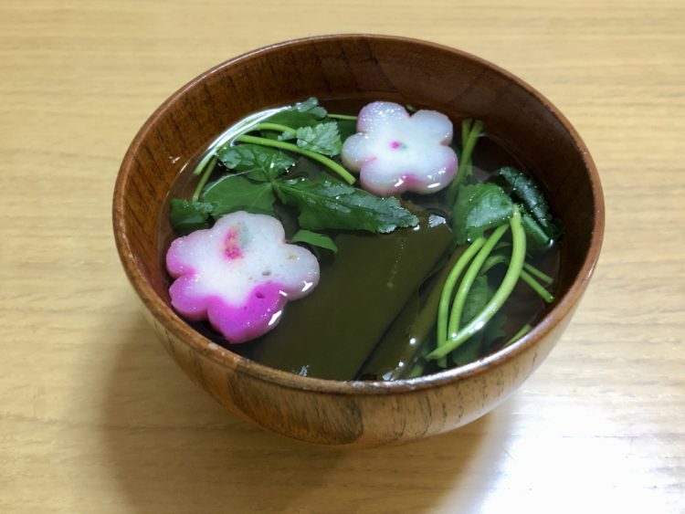 続いて、汁物について考えました。火を入れすぎるのはもったいないので、具材は最後に散らす方法で、お吸い物にしてみましょう。普通の出汁昆布と鰹節でとった出汁に、若生昆布と三つ葉とまつおの花麩をIN。