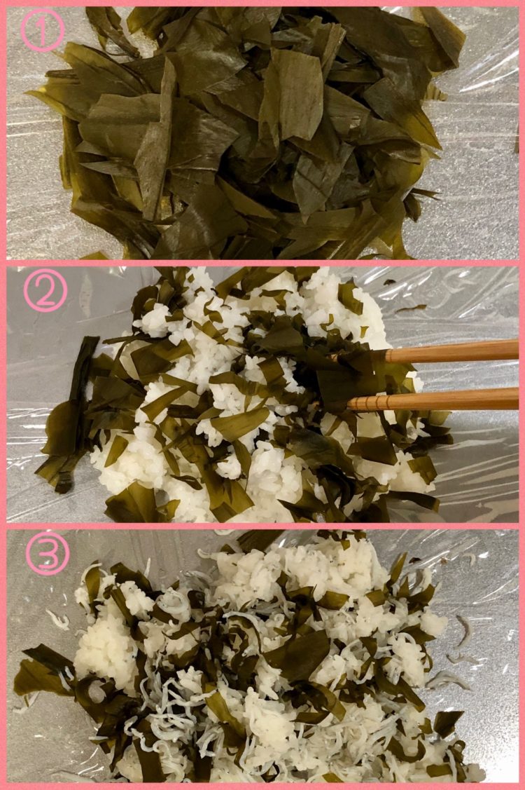 ご飯の上に昆布とじゃこを乗せ、混ぜ込みまーす。