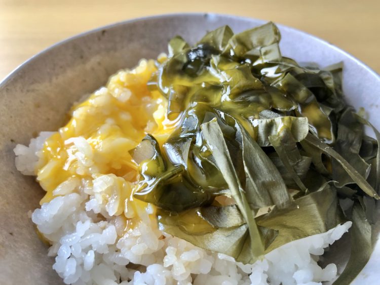 皆さんは、「若生(わかおい)こんぶ」をご存じでしょうか?若生こんぶとは、昆布の繊維が柔らかくて薄い、1年目の若芽の昆布のことです。青森では、炊き立てのあったかいご飯を若生昆布でシンプルに包んだ郷土料理「若生おにぎり」があり、主に津軽地方で食べられていたといわれています。私も若生おにぎりを初めて食べたときは、磯の香りをまとった昆布の塩味とご飯とのバランスが最高で、その美味しさに感動しました!