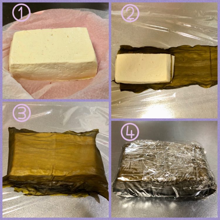 続いて、巻きシリーズでもう一つ。今度は、豆腐でトライ。豆腐は水分が多いので、まずは電子レンジで水分を飛ばします。半サイズの木綿豆腐はキッチンペーパーに包み、耐熱容器に乗せて500wで2分水抜きしました。