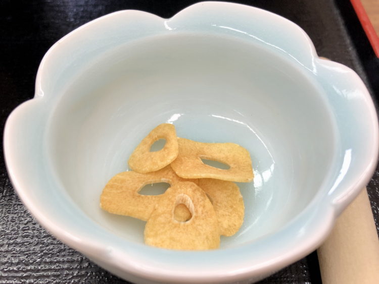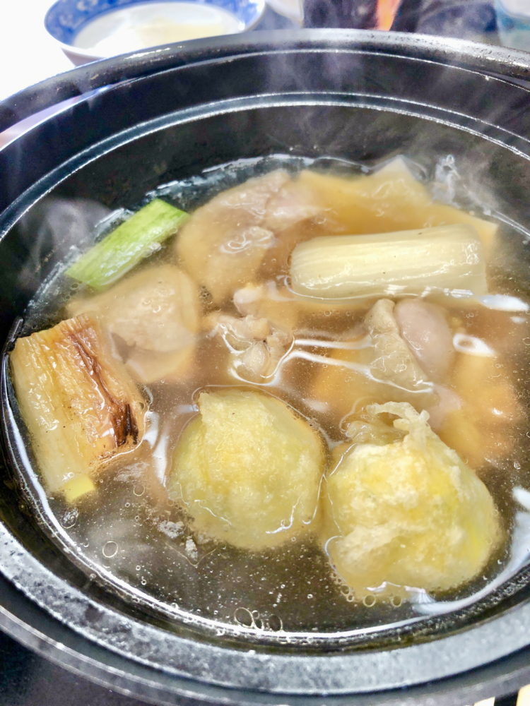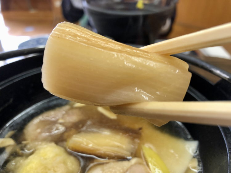 食べてみると、アツアツでした。菊は想像以上にぎっしり!醤油ベースのスープがどの食材にもしみていて、旨味が口の中にじんわり広がります。こんがりと焼けた太ネギも甘くておいしい!あべどりとの相性も抜群です。ニンニクチップを入れたときの味の変わりようも驚きでした。