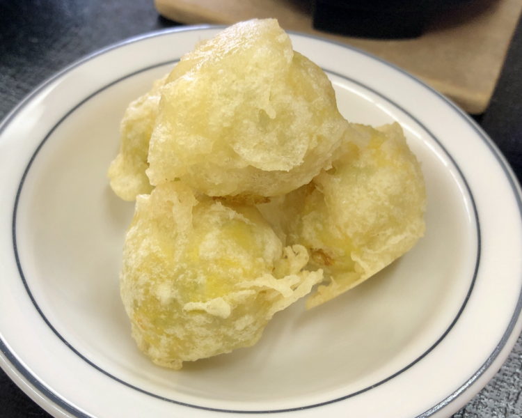 なべまる「まずは菊ボールの意外性を目で楽しんでほしいですね。鍋に入れてから少し煮込んでもよし、早めに取り出して、菊ボールのかたまり感を楽しむのもよし、お好みでお召し上がりください。鍋の具材が少なくなってきたら、麦かっけもどうぞ。ニンニクチップを砕いて入れると、また違ったおいしさを楽しめますよ」