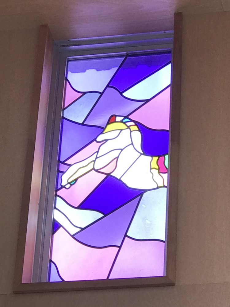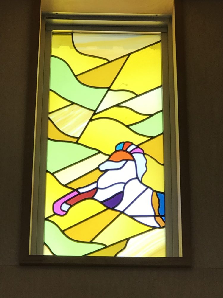 七戸小学校のコンピュータ室上部壁面には、5面のステンドグラス窓があります。教頭の横濱先生が、写真を撮って送ってくださいました。