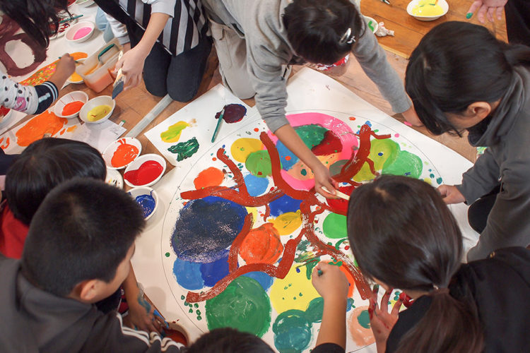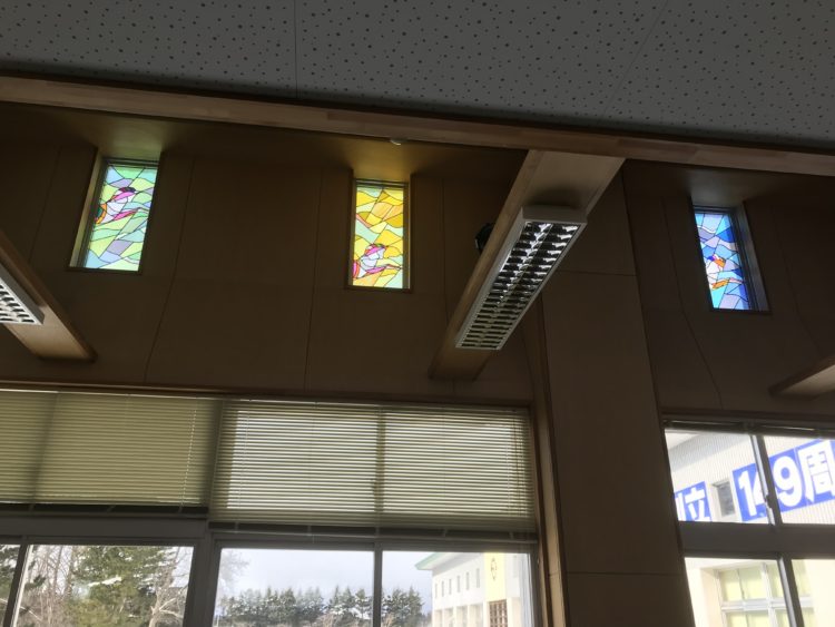 平成22年度、当時5年生だった生徒たちが、ワークショップで自由気ままに表現した18枚のデザイン画を、同小学校の卒業生である八戸市出身の壁画アーチストはやしまりこさんが3点のデザインにコラージュしてまとめ、それをステンドグラスにしたそうなのです。