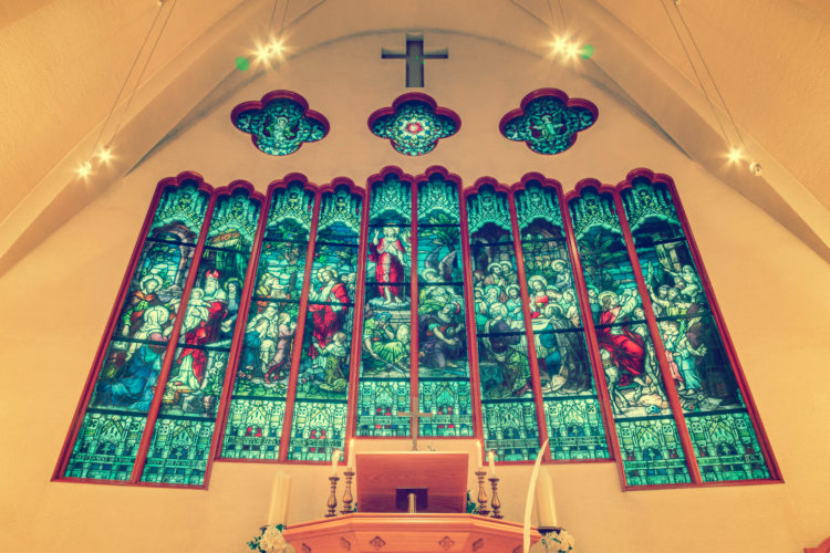 熟練したドイツのガラス職人たちによって生み出された崇高な宗教画。光の当たり具合や時間、見る角度によって、こんなにも色合いが変わるんですね!