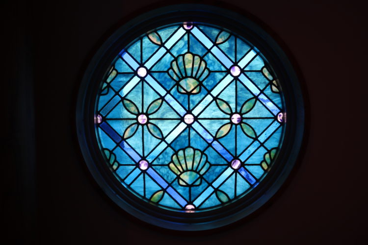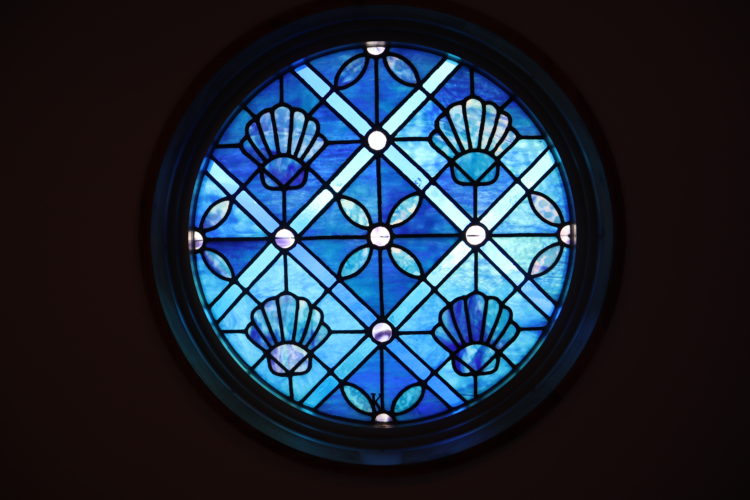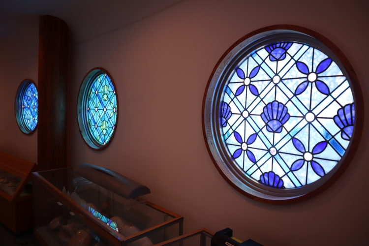 最後は下北半島から。こちらもネットで偶然見つけたステンドグラスです。むつ市の海と森ふれあい体験館の1階シェルミュージアムの壁に、こんな素敵な丸窓が3面並んでいるそうです。スタッフの小池さんが、写真を撮って送ってくださいました。