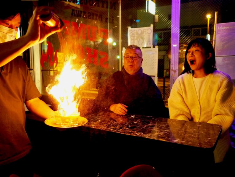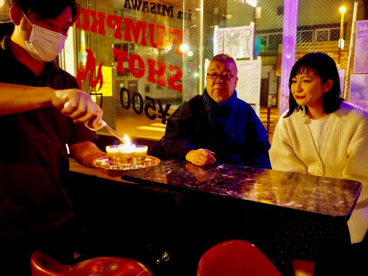 冒頭“火柱”を立てていたのが、こちらの名物「パンプキンショット」。炎を出すためスピリタスを。一気に呑み干すのが流儀です。眞理子さん、お見事! 右が今回の案内人・CROSS×ROAD代表の坂本亘さん。ナイスな夜をありがとう!