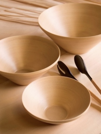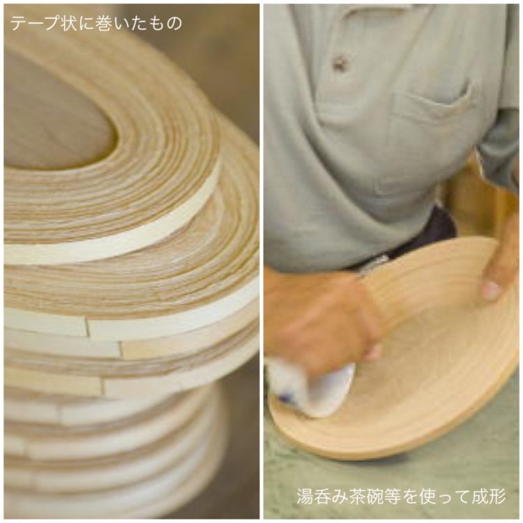 ブナコは、ブナの原木を大根のかつらむきのように薄型に加工し、テープ状にした後、バームクーヘンのように巻き重ね、これを少しずつずらして形を変形させていきます。この熟練の技術により、自由に様々な形やデザインをつくることが可能となります。さらに従来の木の塊を削り出す方法とは異なり、資源を無駄なく使用することができ、とてもエコなのです!