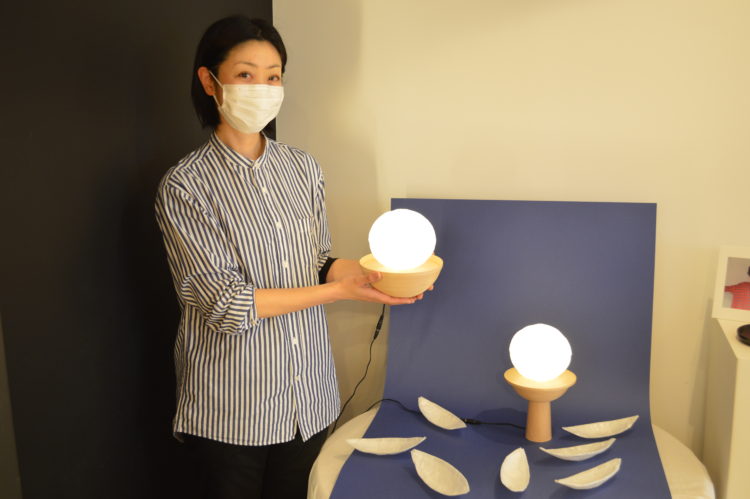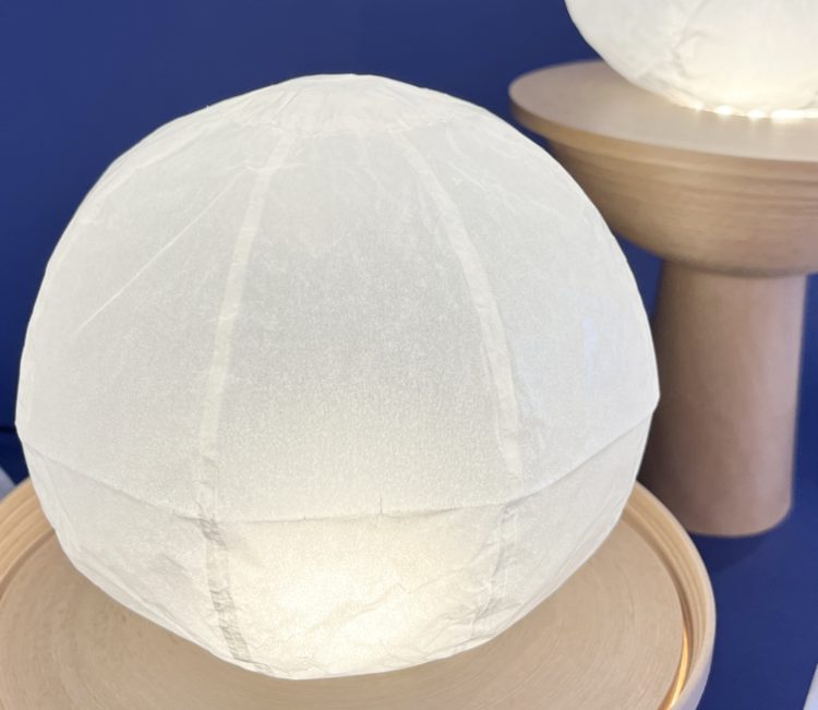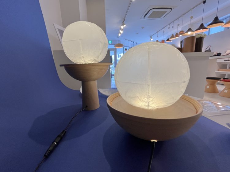 サステナビリティ(持続可能性)をコンセプトとしていて、使われている素材は「木と紙」。それぞれの名称は、写真左から「クルブト」と「クルブト シュ ピエ」。これらは「起き上がりこぼし」と「自立した起き上がりこぼし」という意味の名称なのですが、ゴド夫妻は過去に弘前ねぷた祭りや青森ねぶた祭りを見たことがあり、そこからも着想を得て商品をイメージしてくれたのでは、とブナコの倉田社長は言います。