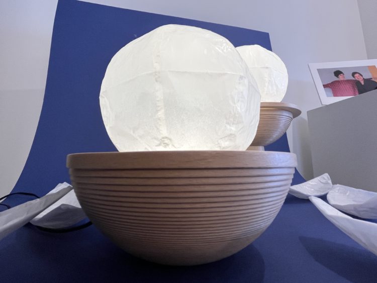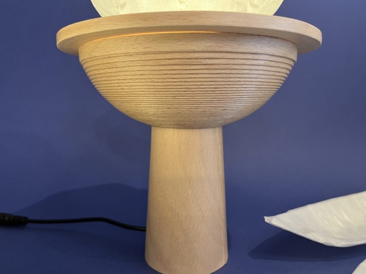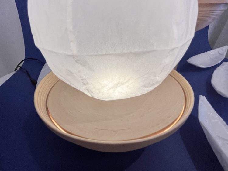 そして紙風船の下部の土台は、全てブナコです。設置面である円状の素材はコイル状に巻いたブナコで、テープを巻いて作っているとは思えないくらいツルツルしていてなめらか。その下のボウル状の土台部分はあえて段差を残すように作られ、クルブト シュ ピエの足土台部分はシート状にスライスしたブナコ素材です。