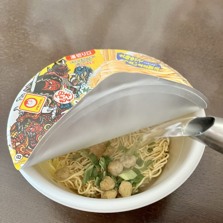フタを開けて、液体スープ、粉末スープを取り出して、かやくを入れてお湯を注ぎます。