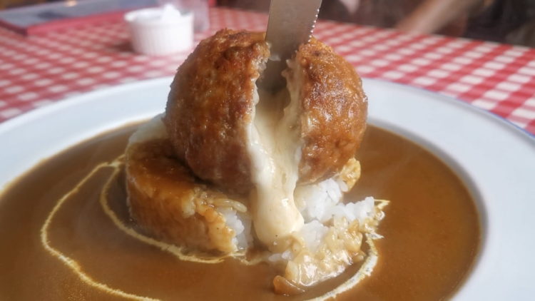 ほどなくそのカレーが登場した。カレールーの海に浮かぶ純白のライスの島。その上に丸いメンチカツがのっている。メンチカツにナイフを入れたら、「あらっ」と思った次の瞬間、中からチーズが「どろん」ととろけ出してきた。