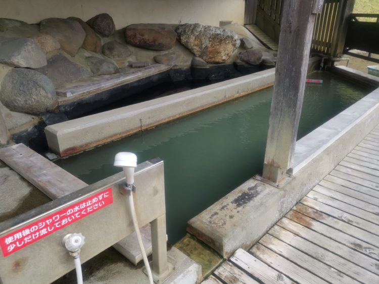 この温泉は湯温が高いことで知られている。係の人が入ってきて水を足し、湯もみを始めた。浴室の隅に水を張った白い家庭用バスタブが2つ並べて置いてある。火照った体を冷やすためで、サウナの水風呂みたいなものだ。お湯が絶えず湯船からあふれ出ている。床に横になれば、いわゆる「寝湯」になる。トド寝にはもってこいではないか。