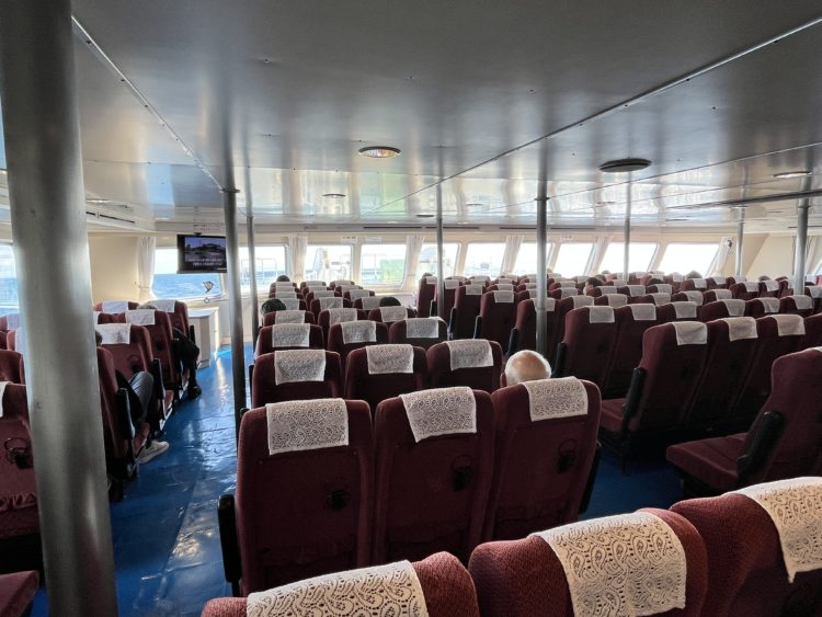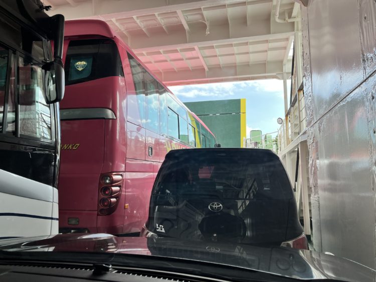 予約しておいたフェリーに乗船するための手続きをします。車検証が必要になります。