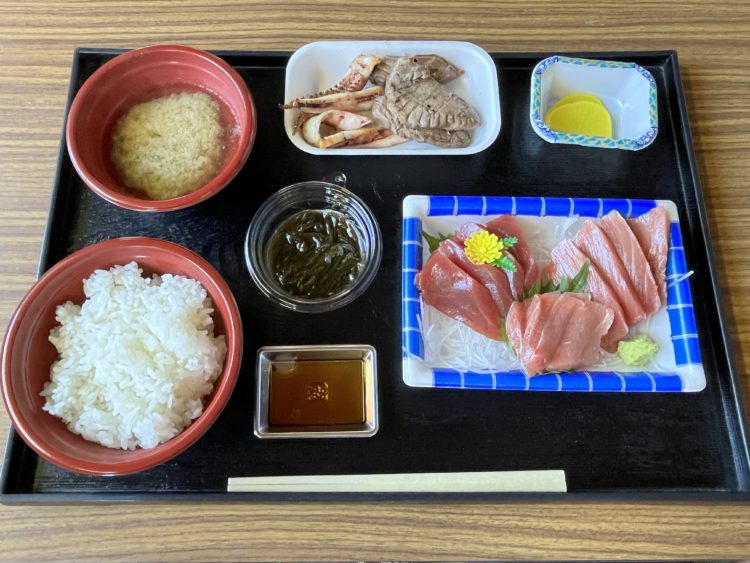 注文した「マグロ定食」には、赤身、中トロ、大トロの刺身が3種類つきます。瑞々しくて、エンドレスで食べられそうなくらい!マジで、最高です!