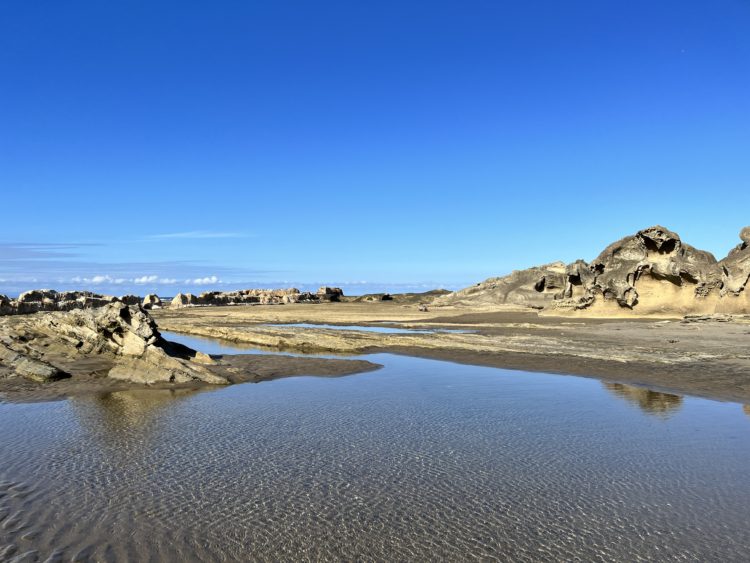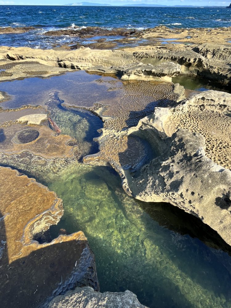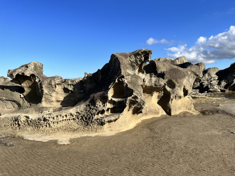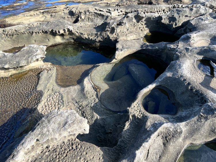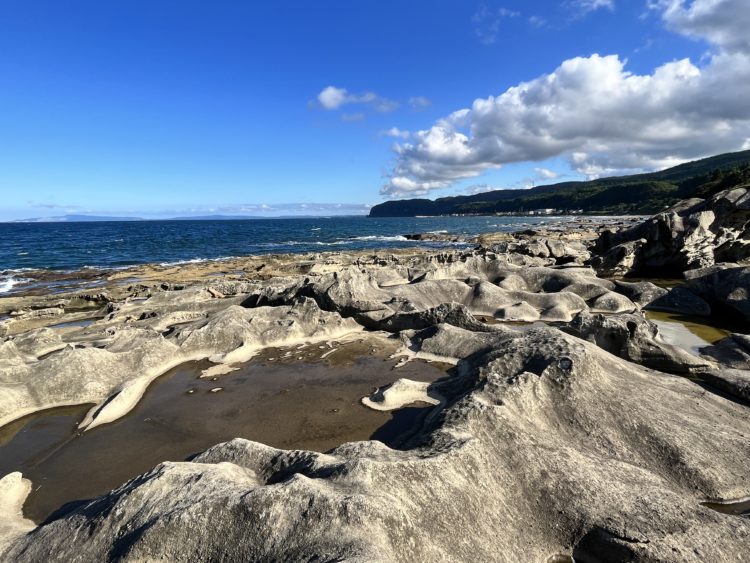 下北ジオパークのジオサイトの一つで、奇妙な形の岩や、岩の表面にあいたポットホール、蜂の巣状構造など、長い時間をかけて波で削られた複雑な形をした岩を見ることができます。