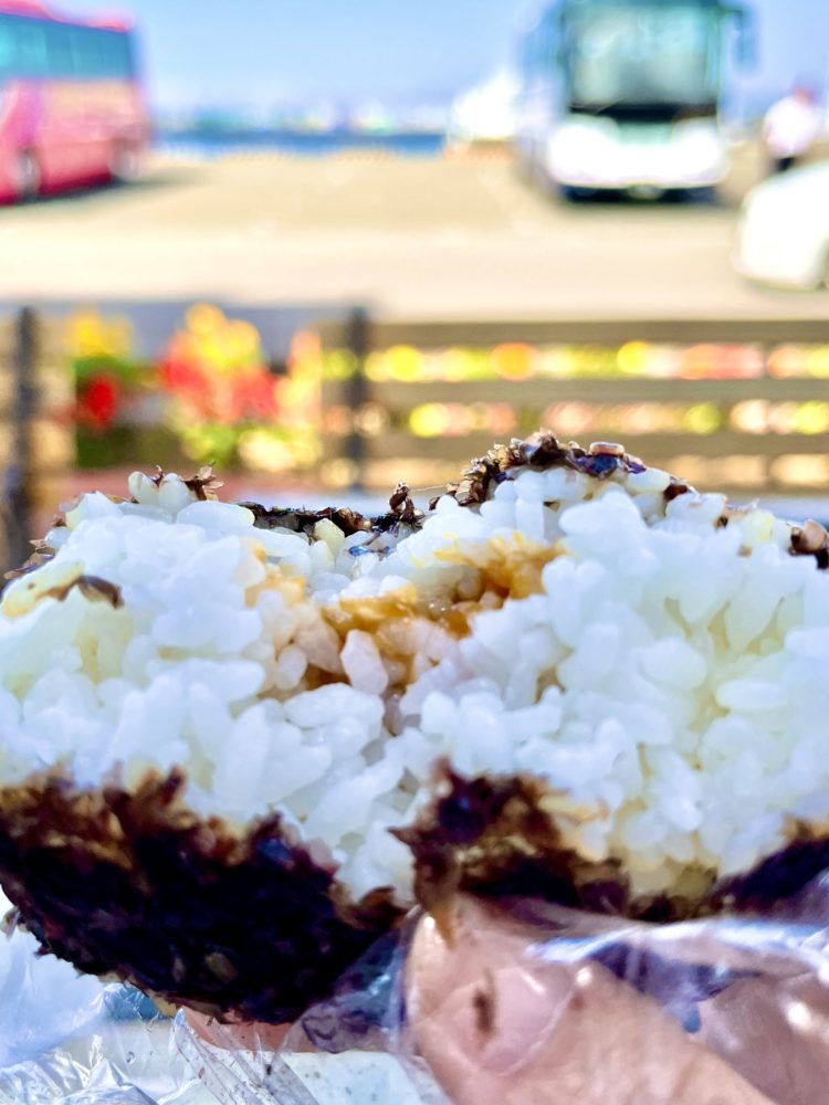 途中、村の駅よもっとに立ち寄り、大好きなタラコのおにぎりをゲット!