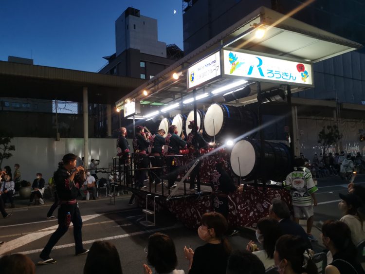 跳人(はねと)はコロナ規制の対象になったらしく、人数が限られロープで囲まれている。跳ねるのが禁止されているのか静かな行進となったが、それでも何人かが我慢できずに少し跳ねた。多い時には1台に2000人もの跳人が連なり跳ねに跳ねるというから、そのエネルギーはどれほどのものだろう。踊るのではなく、様式に縛られず跳ねる。そこに原初の匂いが漂う。