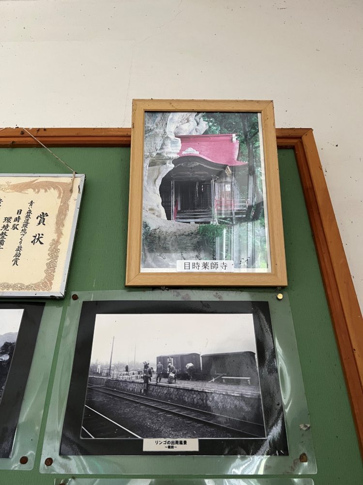 さて、2メートル氏と再会しまして。駅にはほかに誰もいないし、駅前にも特に何もない。駅の中の壁には写真が貼ってあり、目時近辺の名所らしきところがいくつか解説してあります。